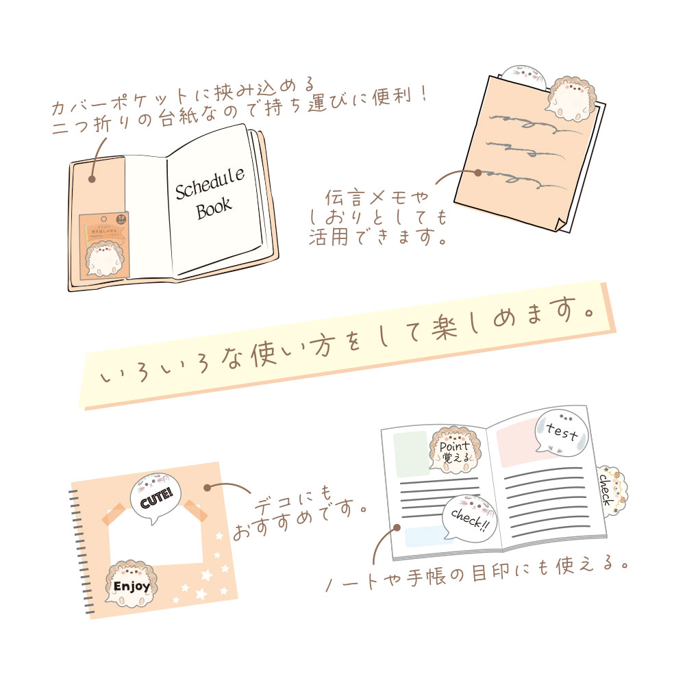 大容量の50枚綴り。 いろいろな使い方をして楽しめます。 手帳等のカバーポケットに挟み込める二つ折りの台紙なので、 持ち運びに便利!伝言メモやしおり、ノートや手帳の目印にも使えます。