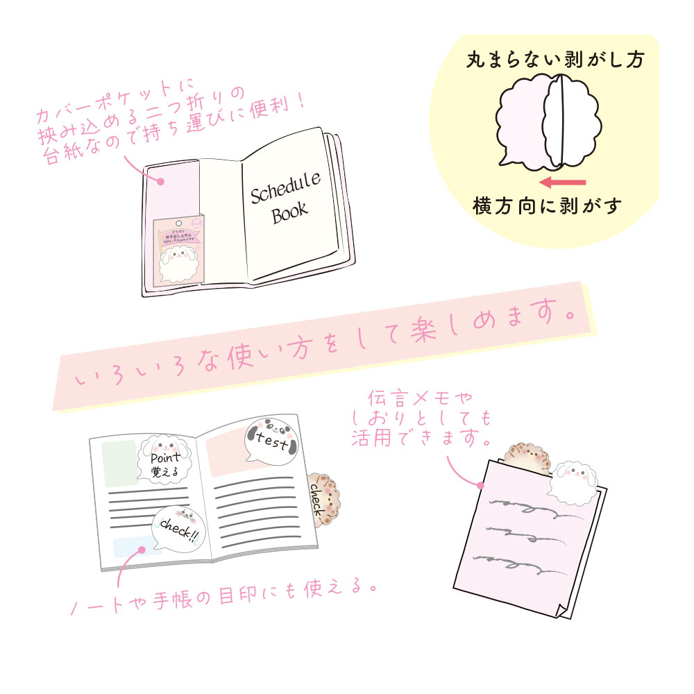 大容量の50枚綴り。 いろいろな使い方をして楽しめます。 手帳等のカバーポケットに挟み込める二つ折りの台紙なので、 持ち運びに便利!伝言メモやしおり、ノートや手帳の目印にも使えます。