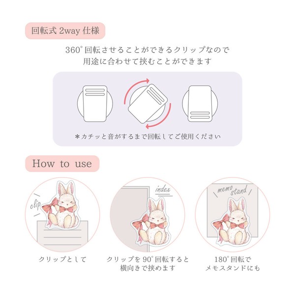 ●回転式2Way使用 360°回転させることができるクリップなので用途に 合わせて挟むことが出来ます。