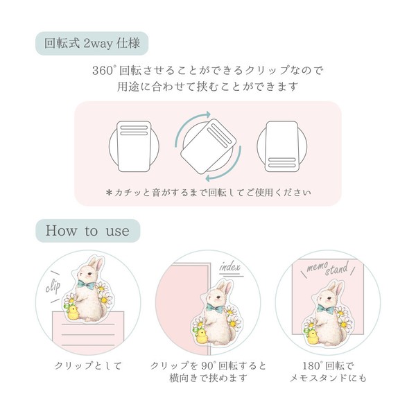 ●回転式2Way使用 360°回転させることができるクリップなので用途に 合わせて挟むことが出来ます。