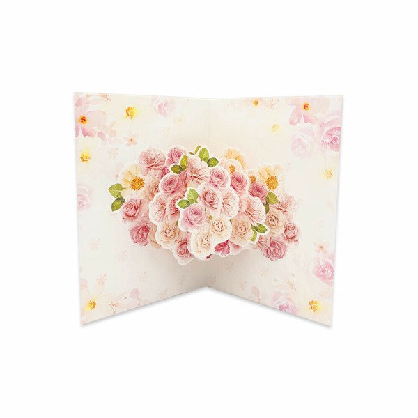 花のアレンジメントの立体モチーフが付いた誕生日ポップアップグリーティングカード。カード開くと花々が飛び出してきます。カード裏面にメッセージが書き込めます。