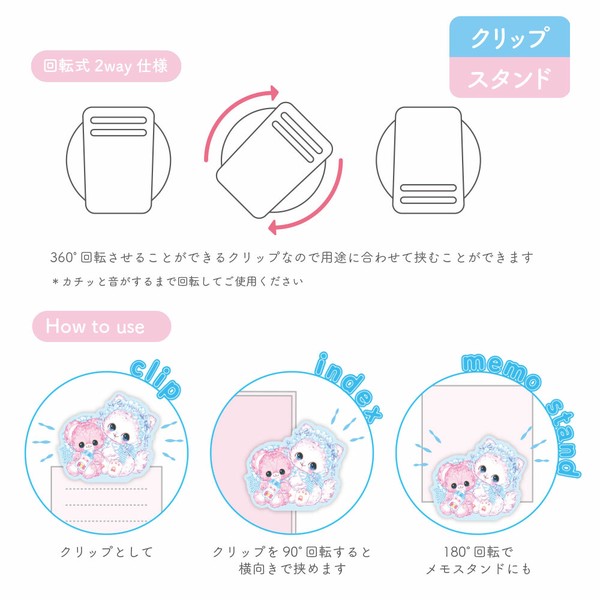 ●回転式2Way使用 360°回転させることができるクリップなので用途に 合わせて挟むことが出来ます。