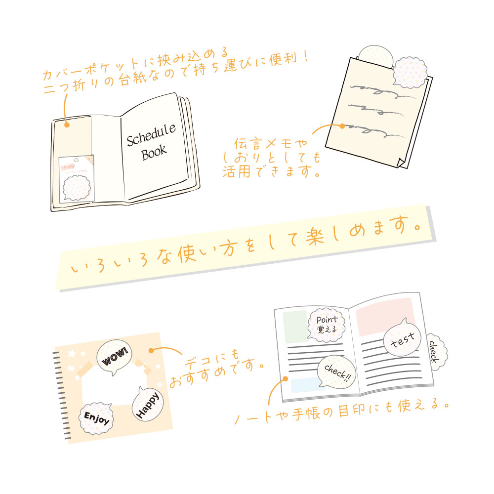 伝言メモやしおり、ノートや手帳の目印にも使えます。